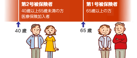 介護保険の被保険者は、その市区町村に住所のある40歳以上の全ての方(一部の適用除外者を除く)で、年齢によって第1号被保険者と第2号被保険者に分けられています。